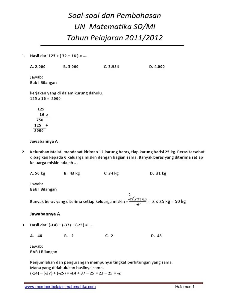 Berikut ini adalah soal ujian nasional (un) matematika kelas 6 sd/mi terbaru tahun ajaran 2017/2018. Nah bagi adik adik yang sedang mencari contoh soal latihan un matematika untuk kelas 6 sd. Download soal usbn/un sd tahun ajaran 2019/2020 prediksi & tryout bahasa indonesia, matematika, ipa, dilengkapi dengan 5 soal uraian dan pembahasannya. Matematika study center, soal dan pembahasan jawaban ujian nasional un sd matematika tahun 2011 paket 1 sd/mi soal nomor 1 sampai 10. Latihan soal & pembahasan ujian nasional matematika sd.